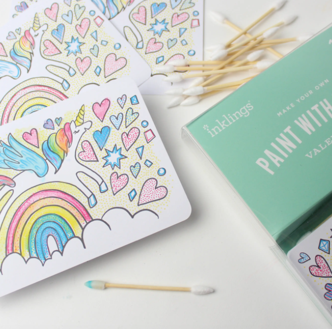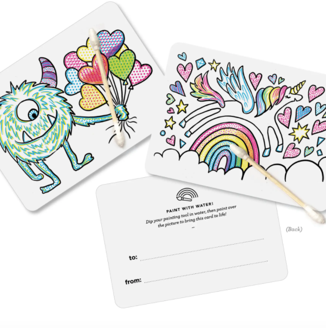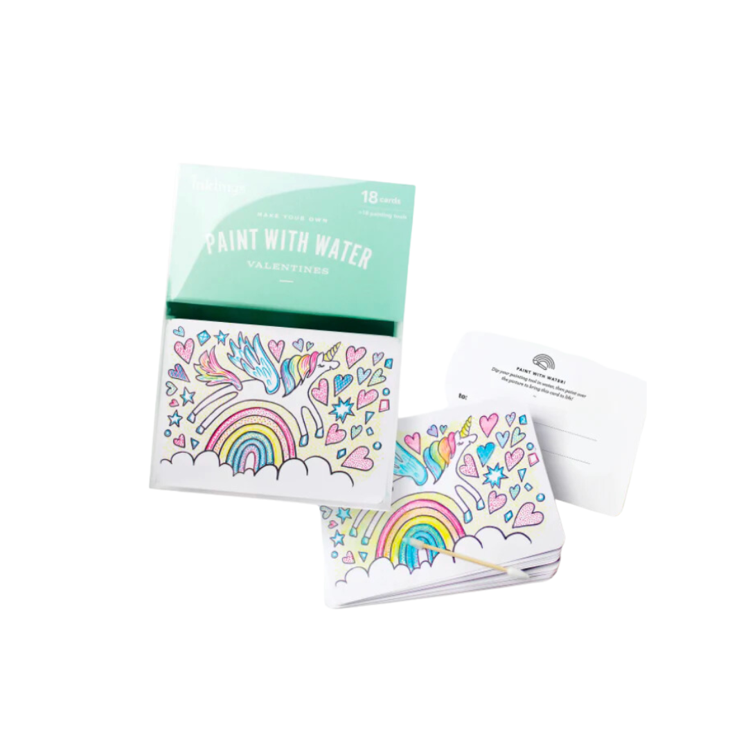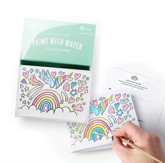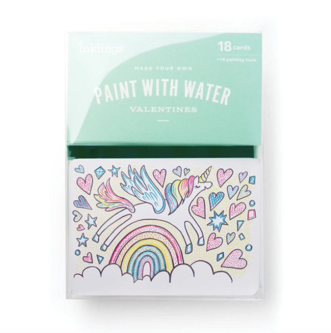 NEW Paint With Water Valentine Kits are fun and interactive for all ages. Each box of valentines includes 18 flat cards (To/From on back), 18 painting tools, and 18 adhesive dots. Dip the cotton tip in water, then brush it over the card to bring the colors to life! Give your friends a sweet valentine and also an activity they can enjoy! Printed with vibrant, non-toxic inks. Card Size: 5.25" W x 3.75" H Box Size: 5"W x 7" L x 0.5" D