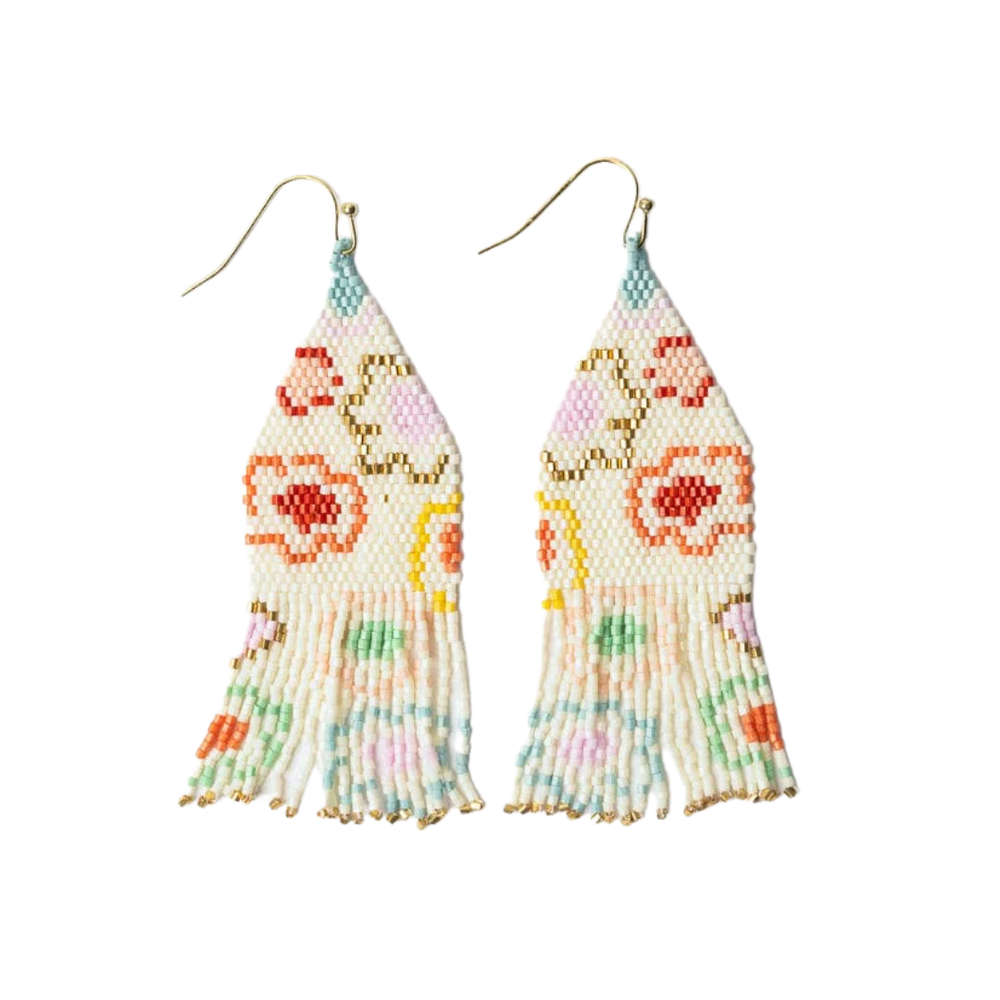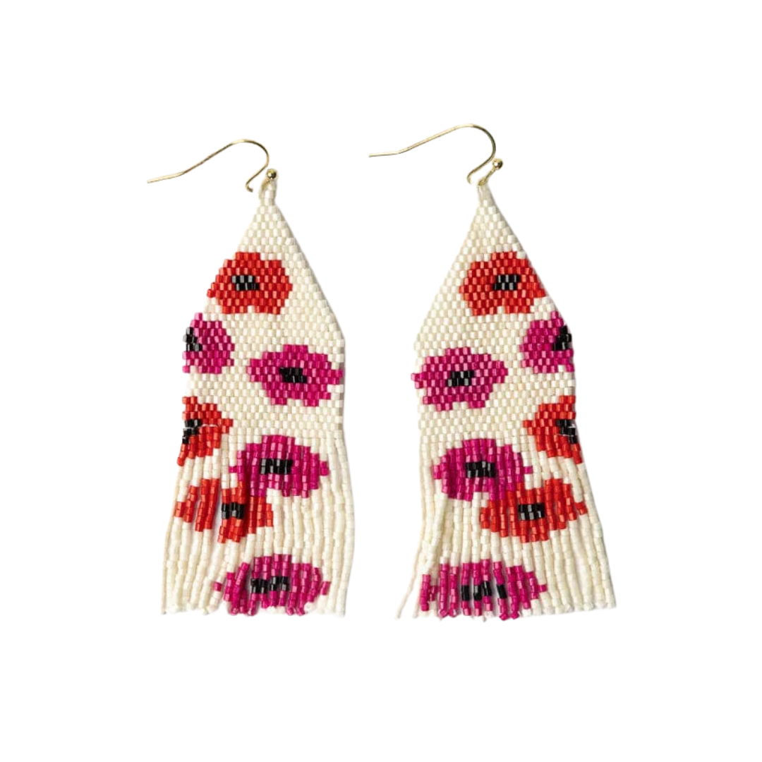 A joyful burst of color you can wear. These vibrant earrings feature intricate beadwork showcasing a playful poppy motif, finished with breezy fringe that moves beautifully with you. Bold, bright, and guaranteed to stand out! ☀️