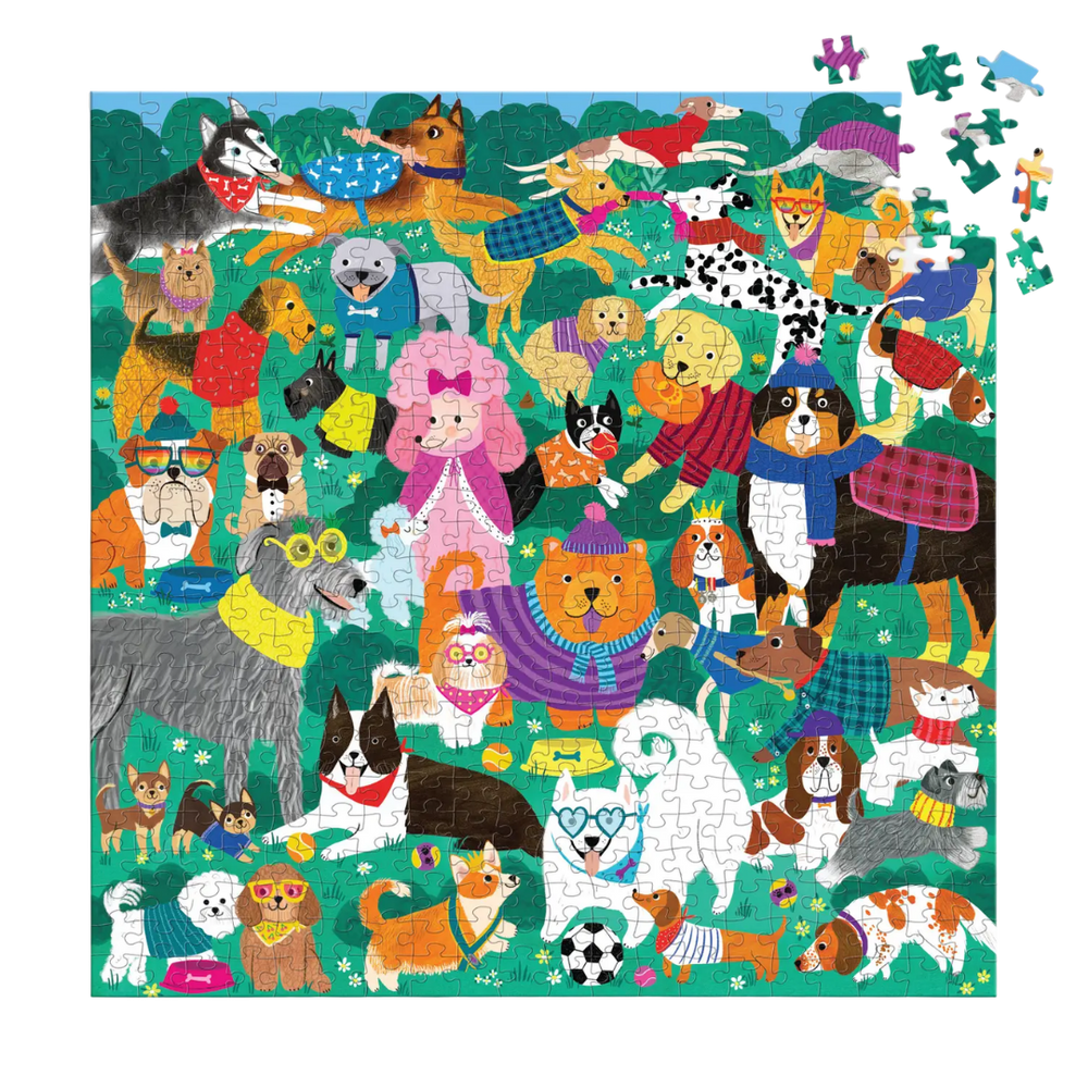 A puzzle bursting with personality and playful detail. This lively illustration captures a busy dog park scene filled with pups of all shapes, sizes, and attitudes — with quirky surprises tucked into every corner!