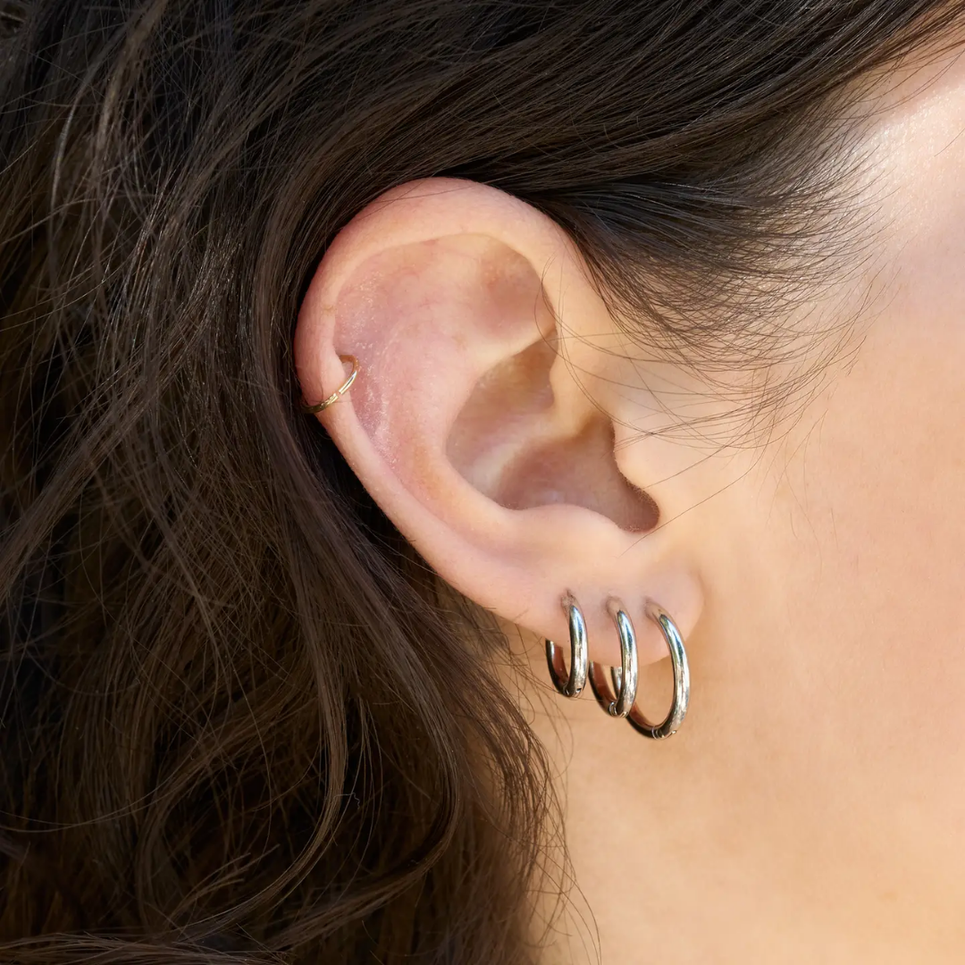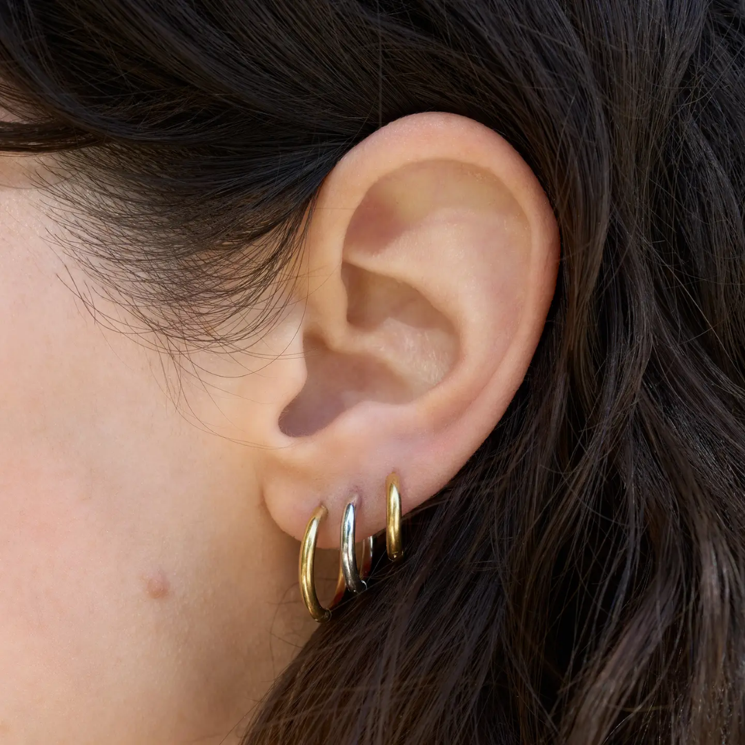 A classic essential with everyday versatility. These sleek hoops are designed for effortless styling, whether worn solo or stacked.